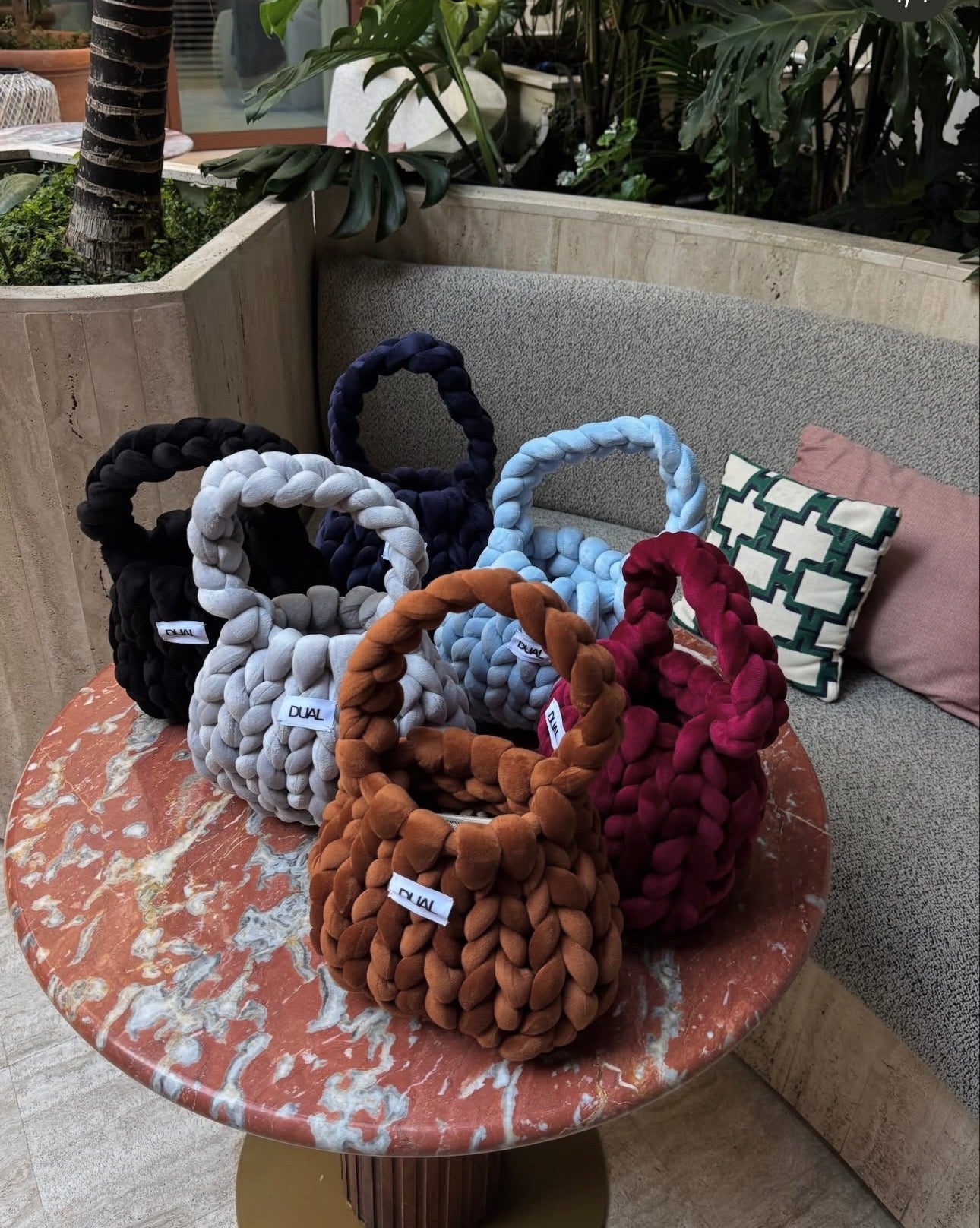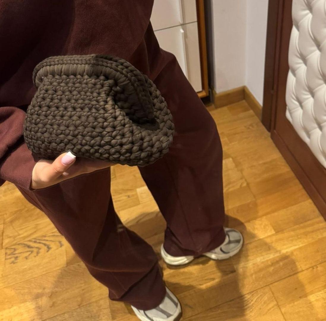 Piccola borsa a mano realizzata in filato irlandere con le mani in diverse varianti colori.