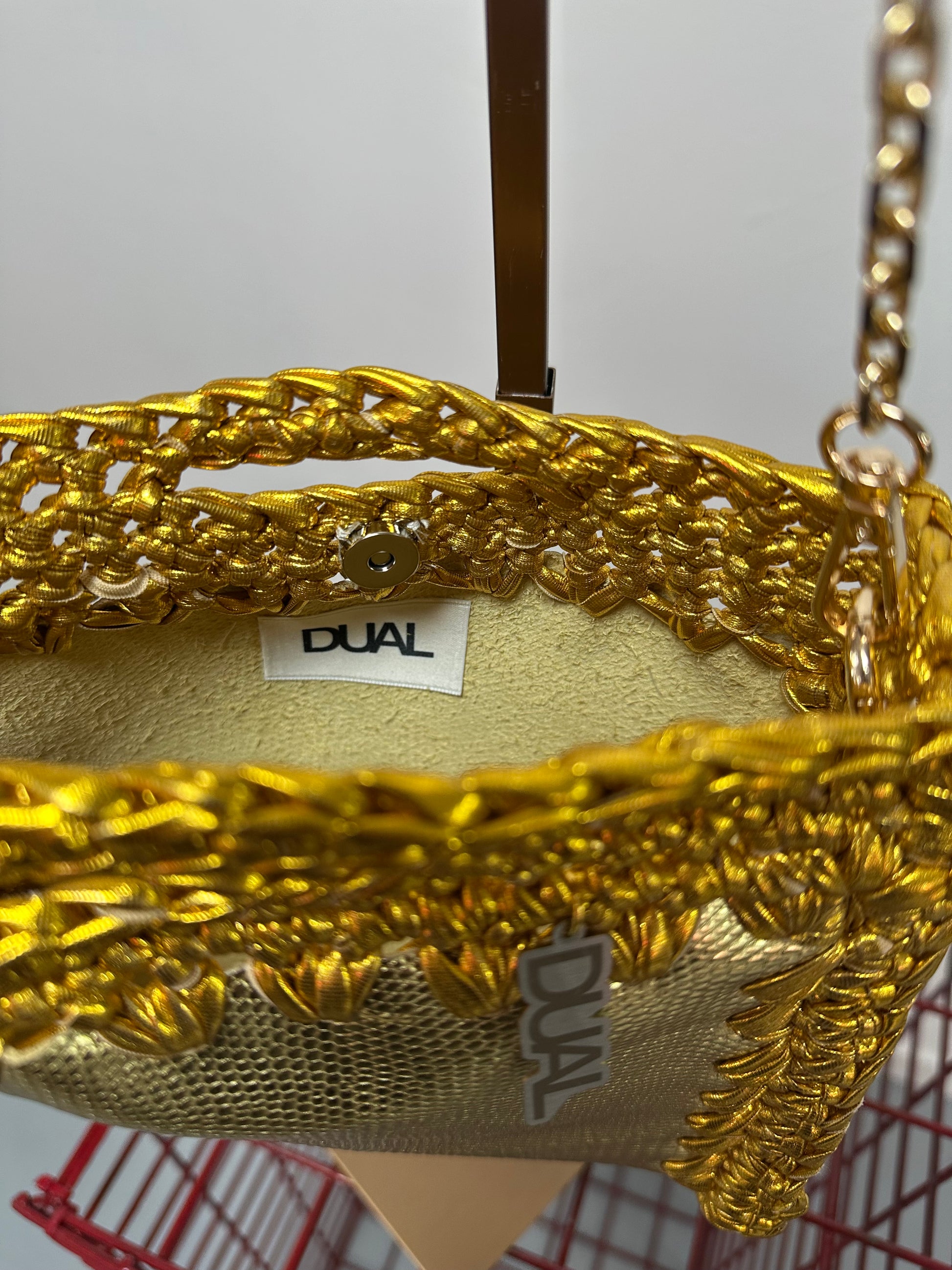 Borsa elegante da sera in filo laminato con base in pelle. Dotata di tracolla in catena inclusa, può essere portata a mano o a spalla. Chiusura interna con bottone automatico ed etichetta a pendolo in metallo.
