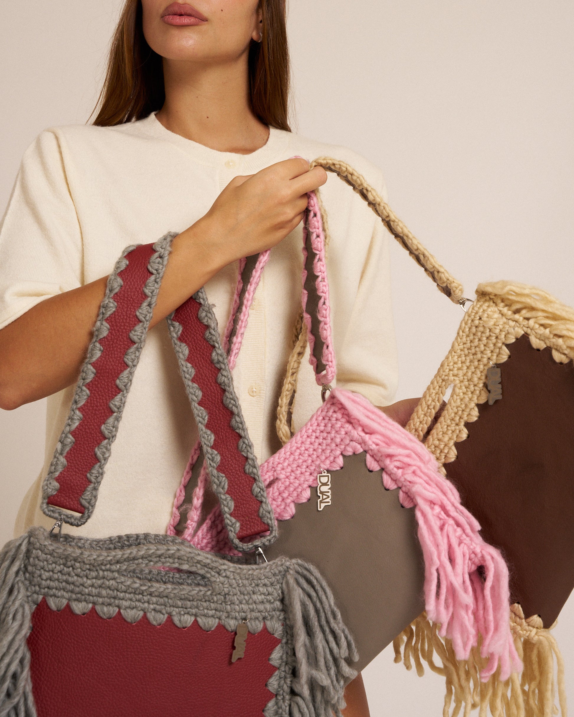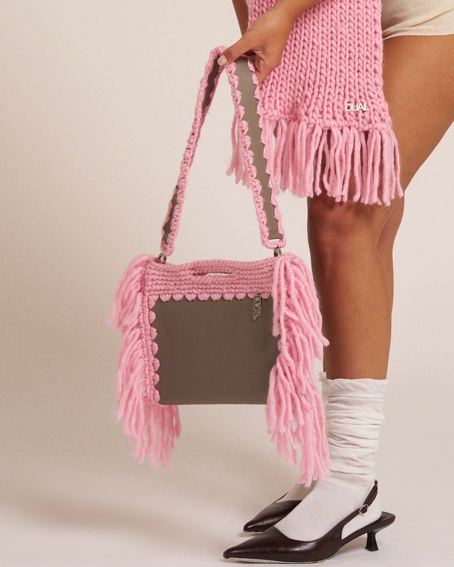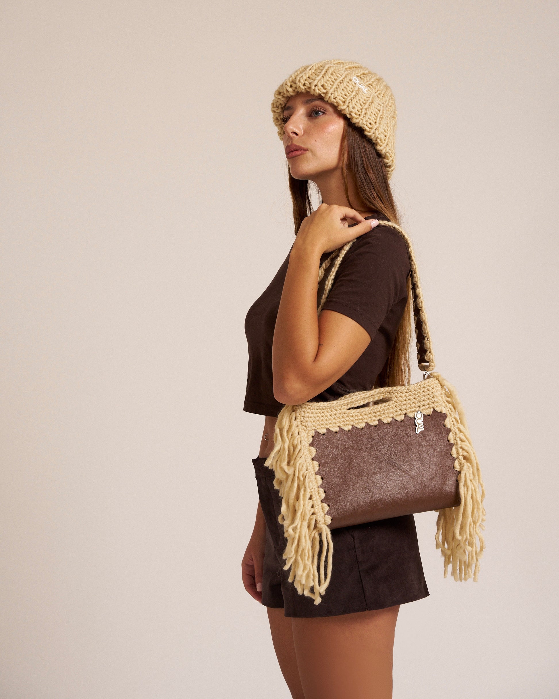 Borsa realizzata in vera pelle e lana Merino 100% vegetale, perfetta per la stagione invernale.