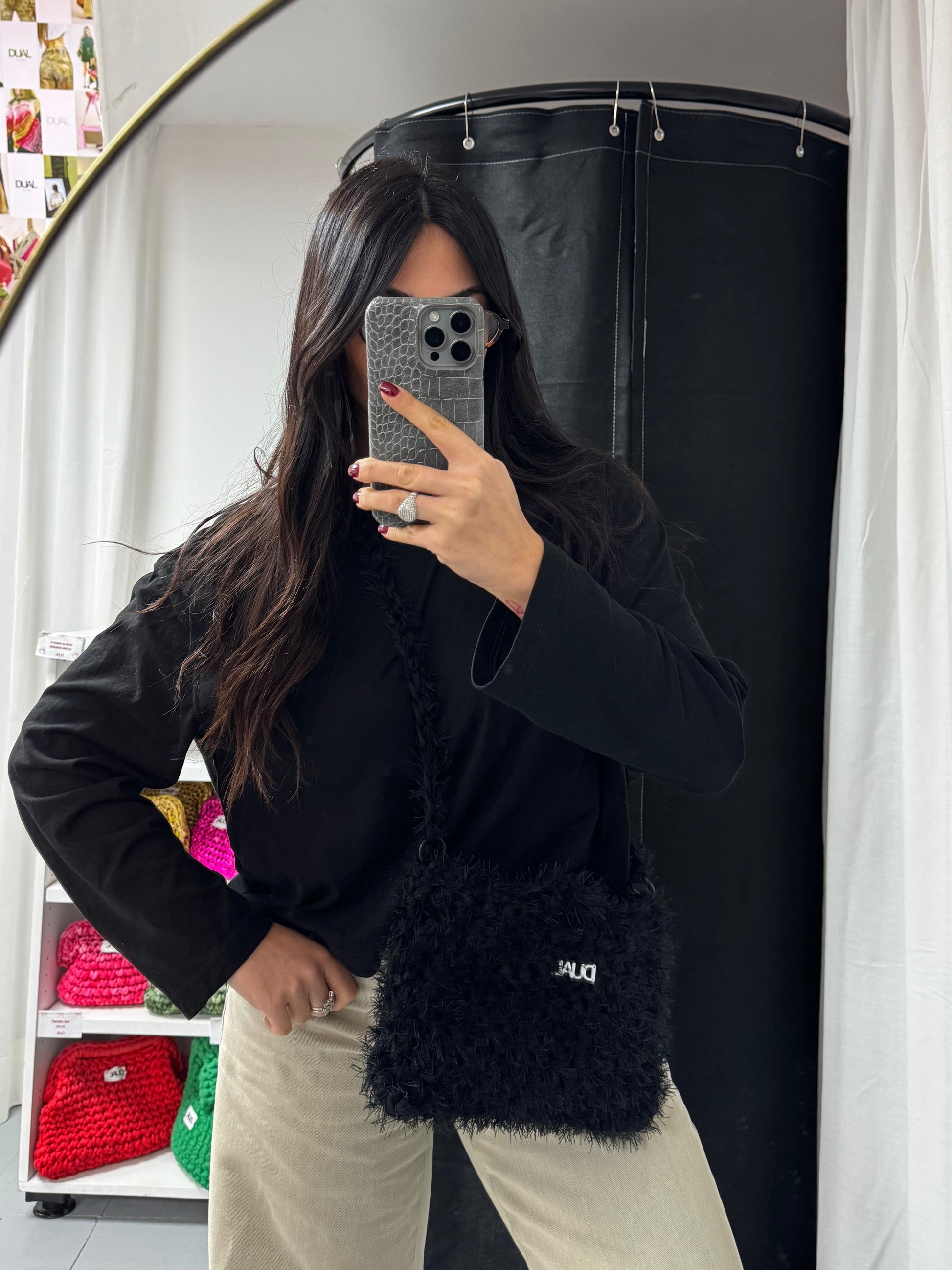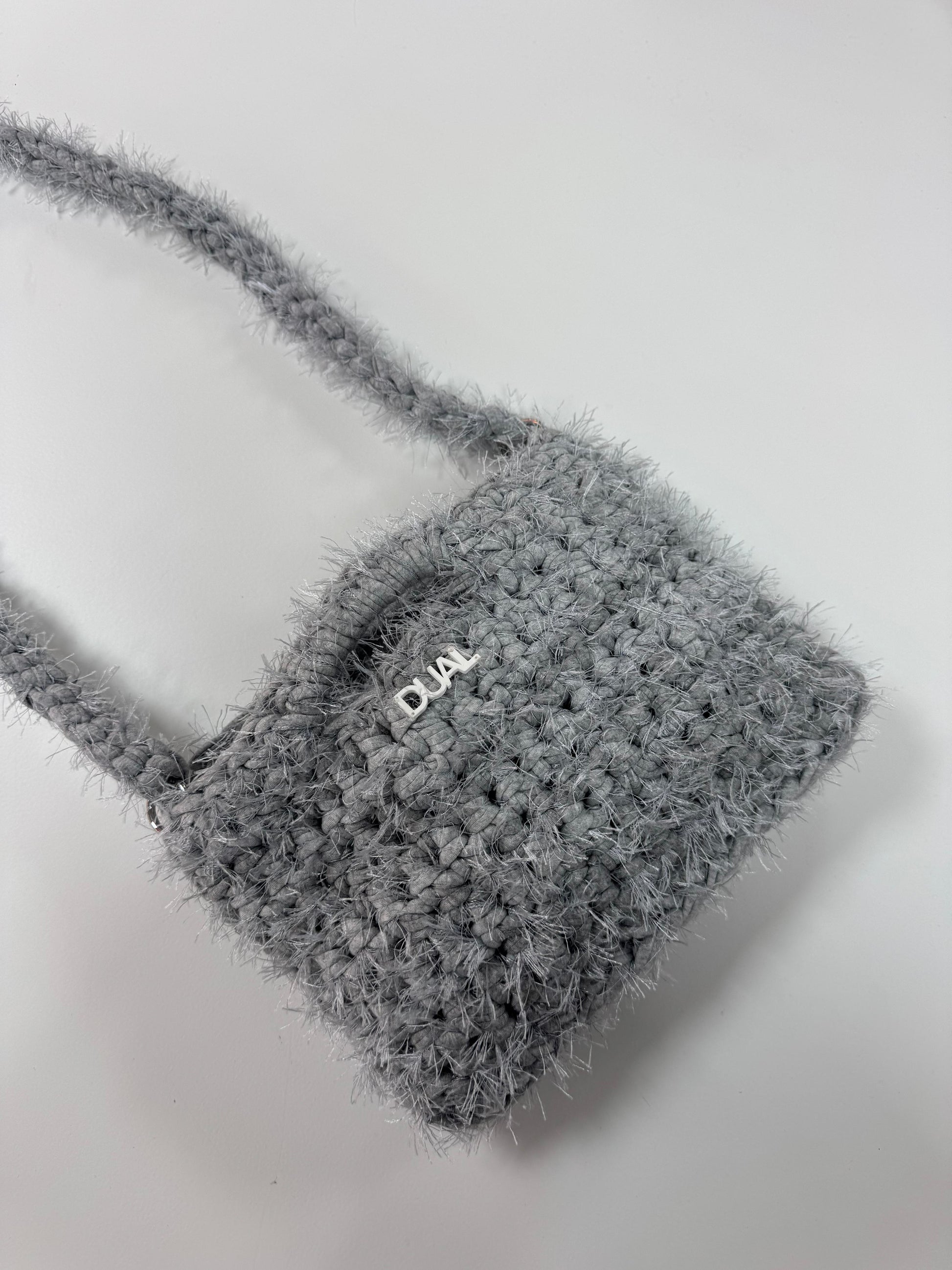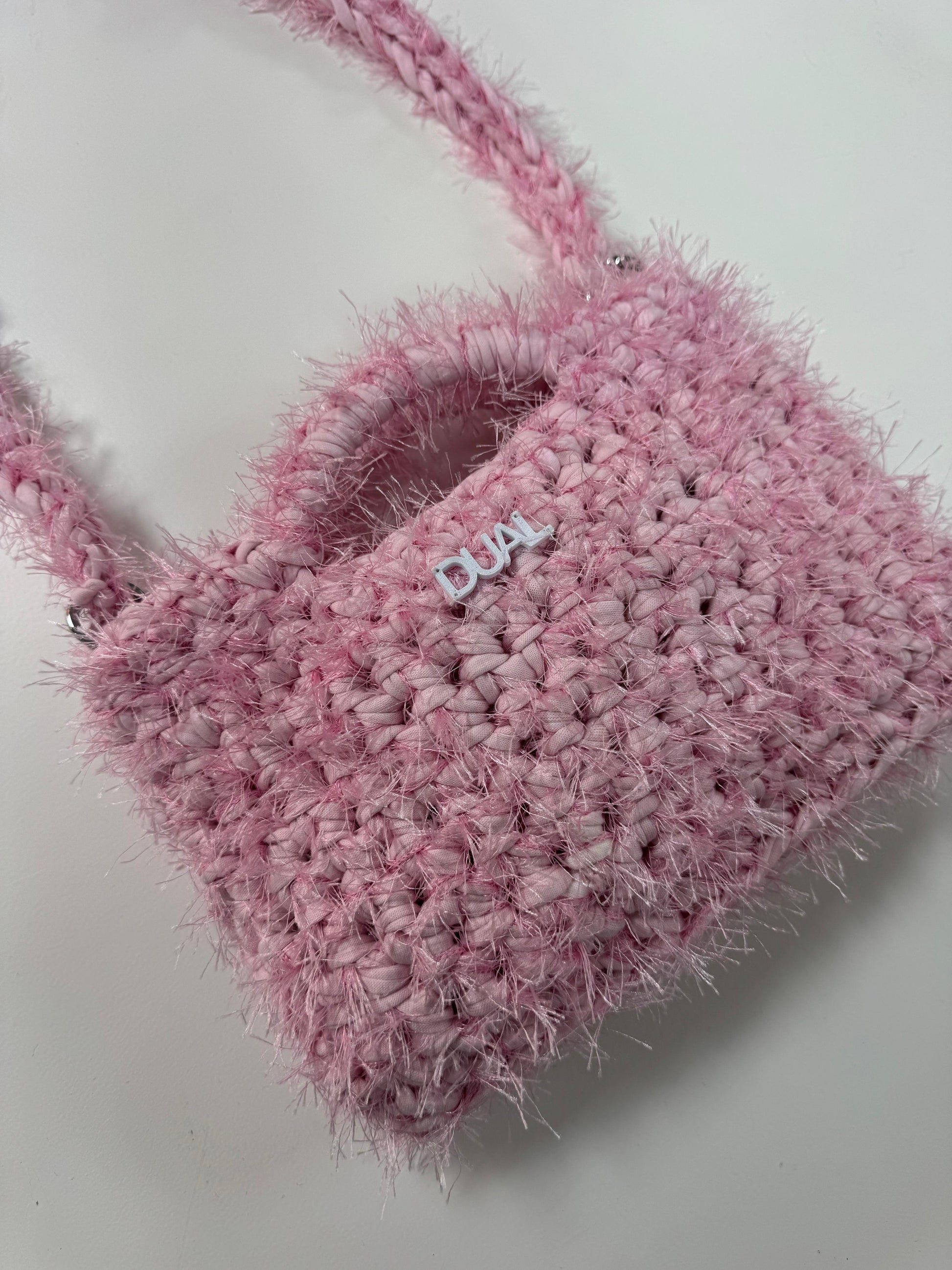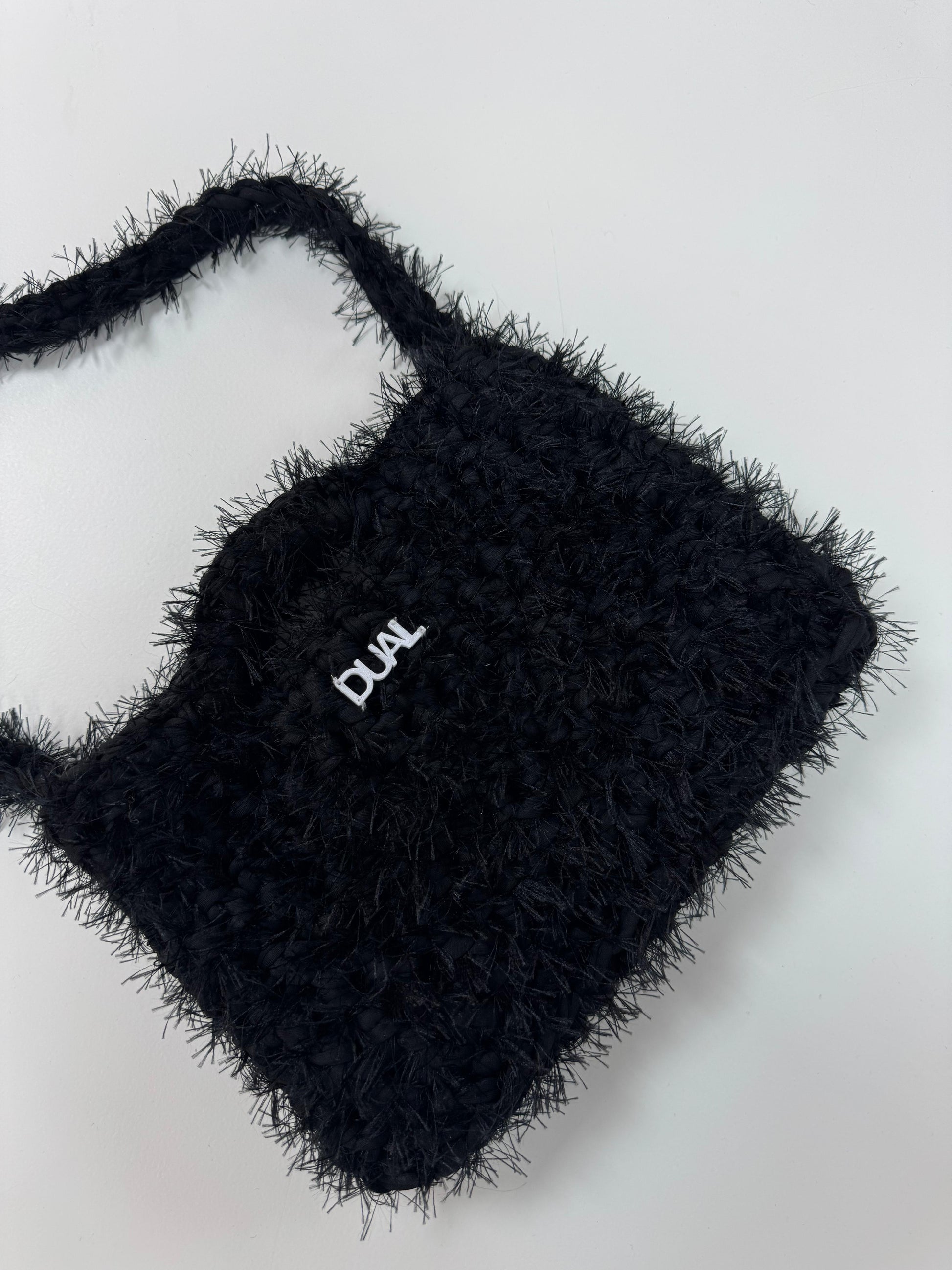 Borsa realizzata con filato in fettuccia e filato fur, morbida e leggera, perfetta per l’uso quotidiano.