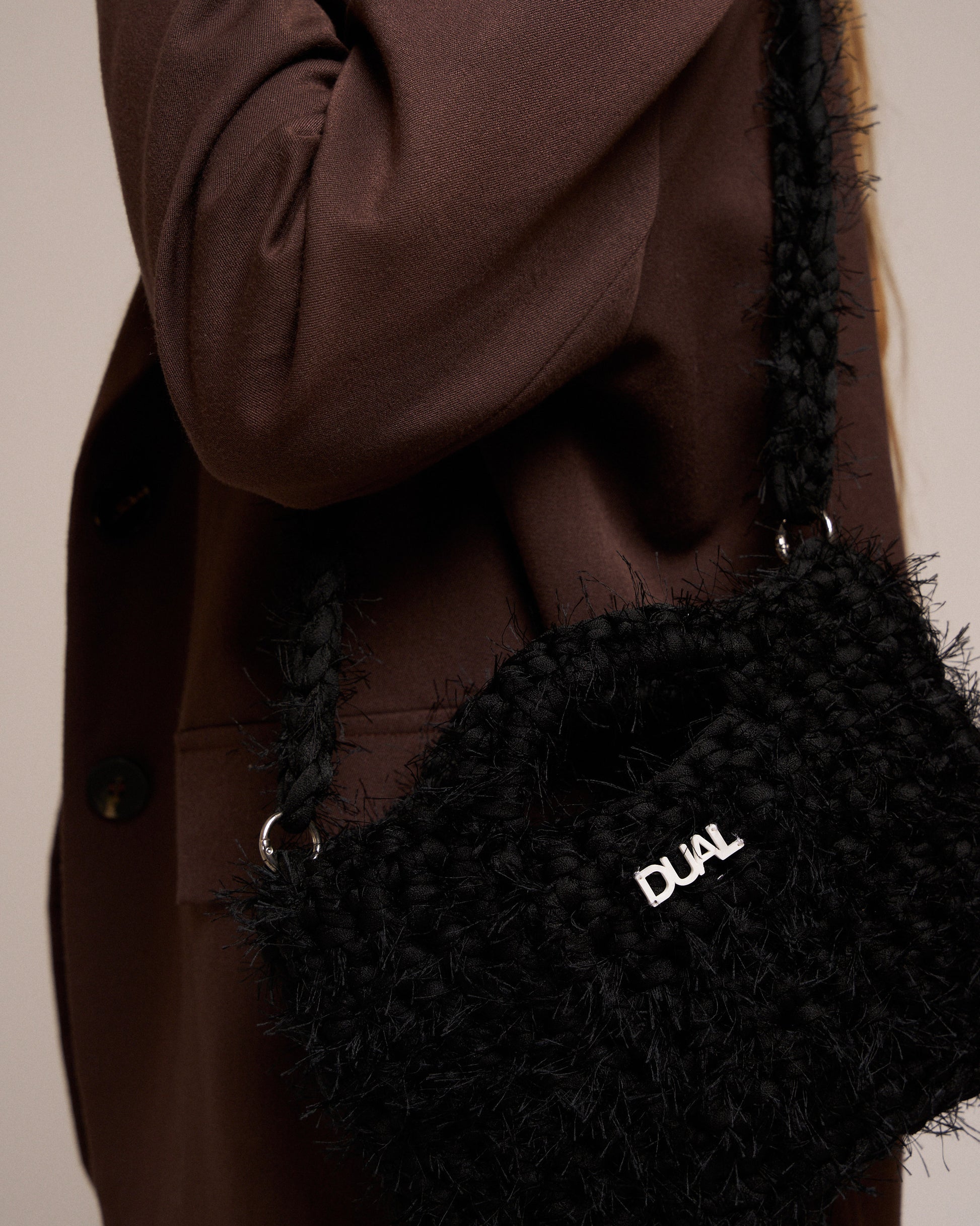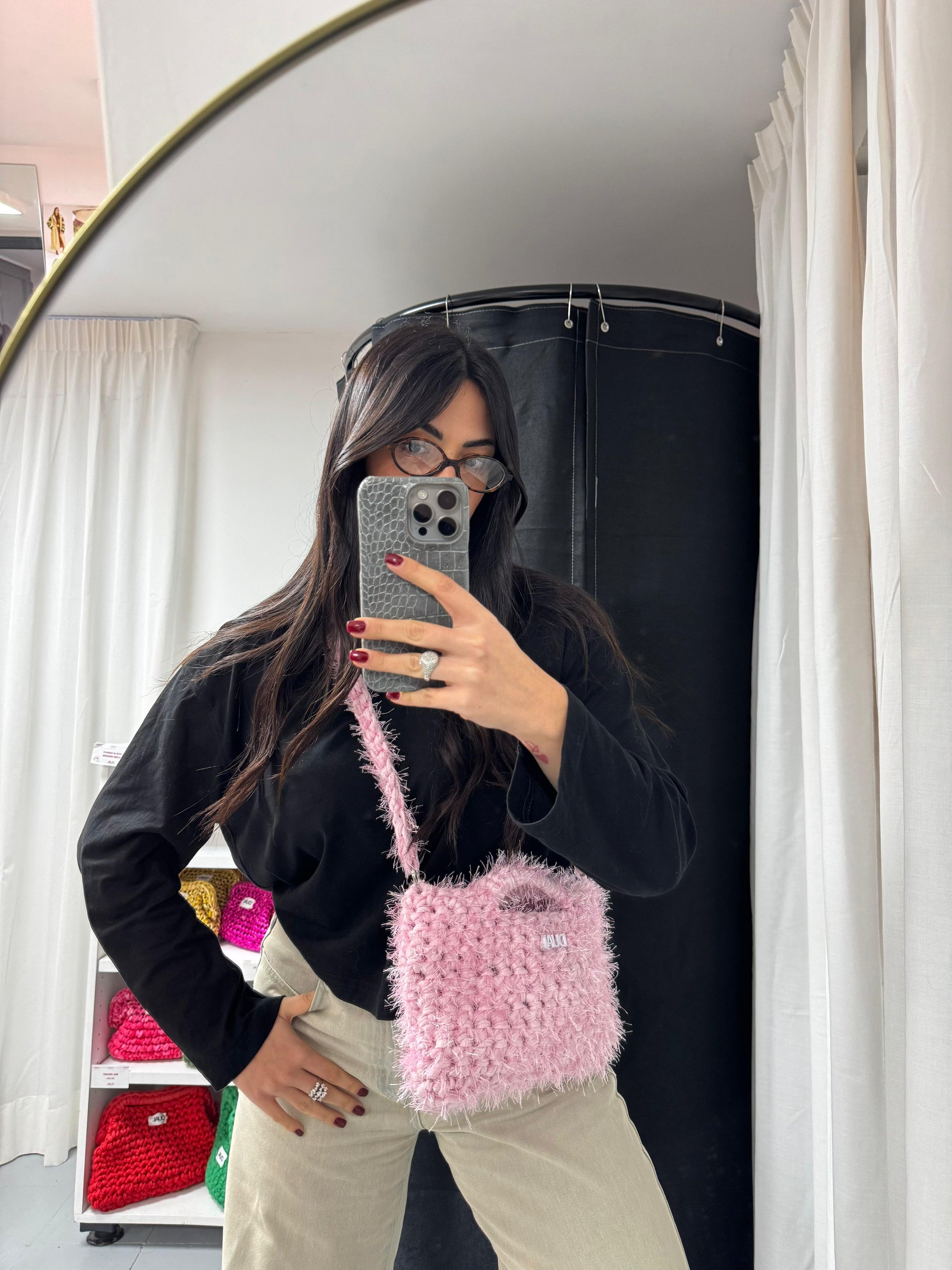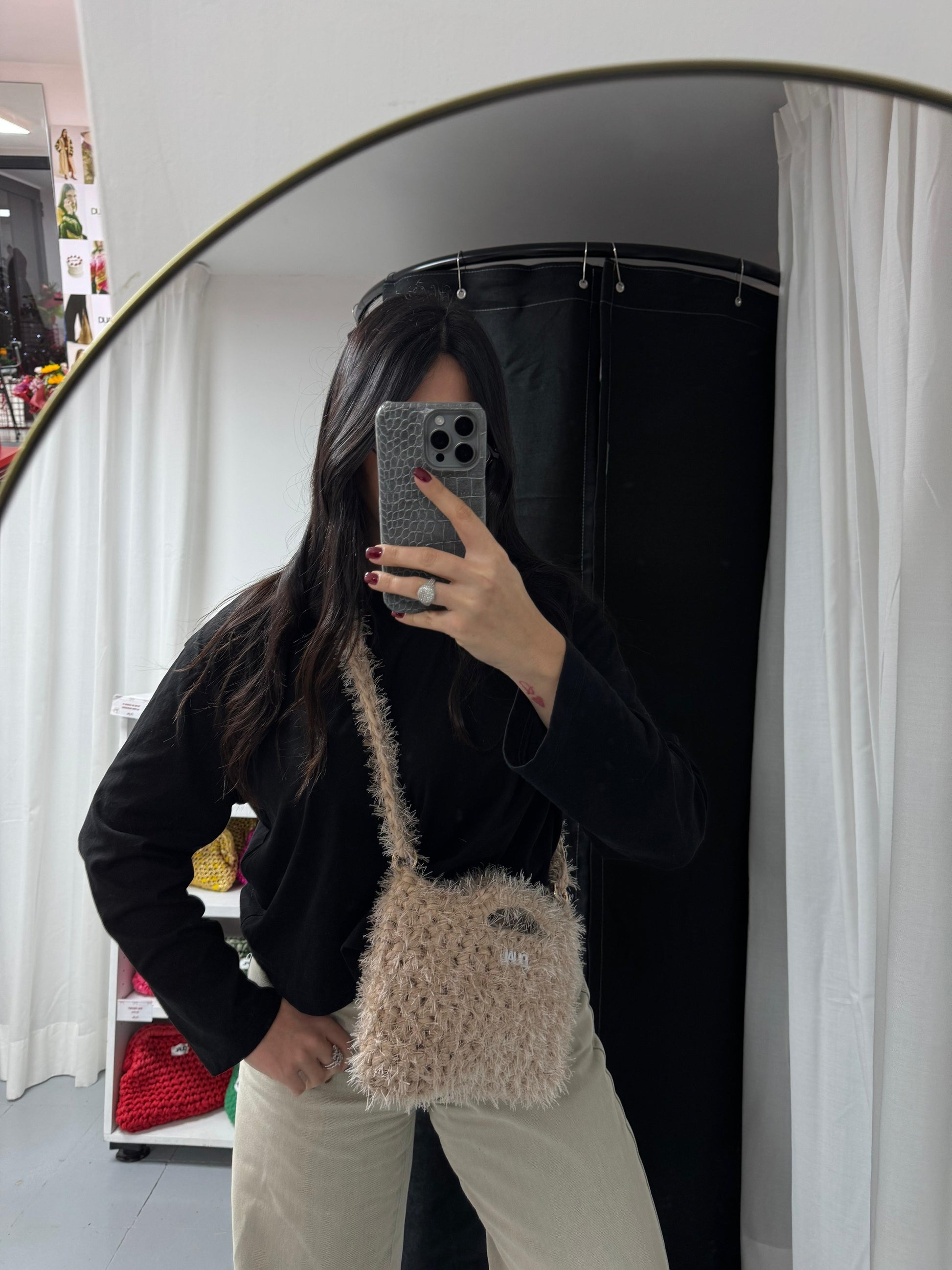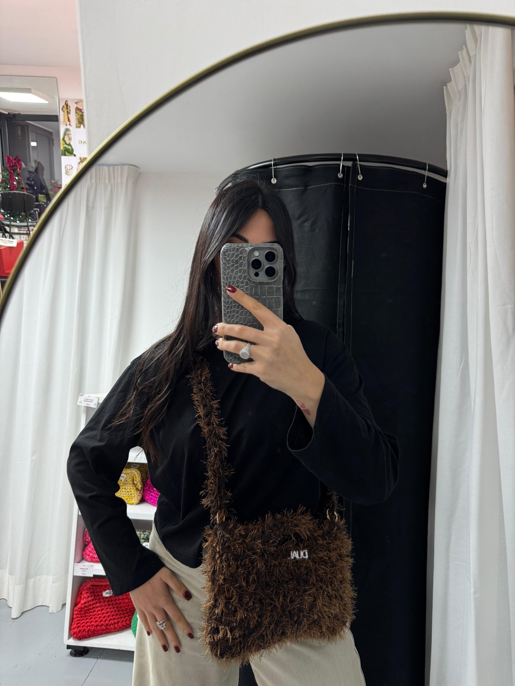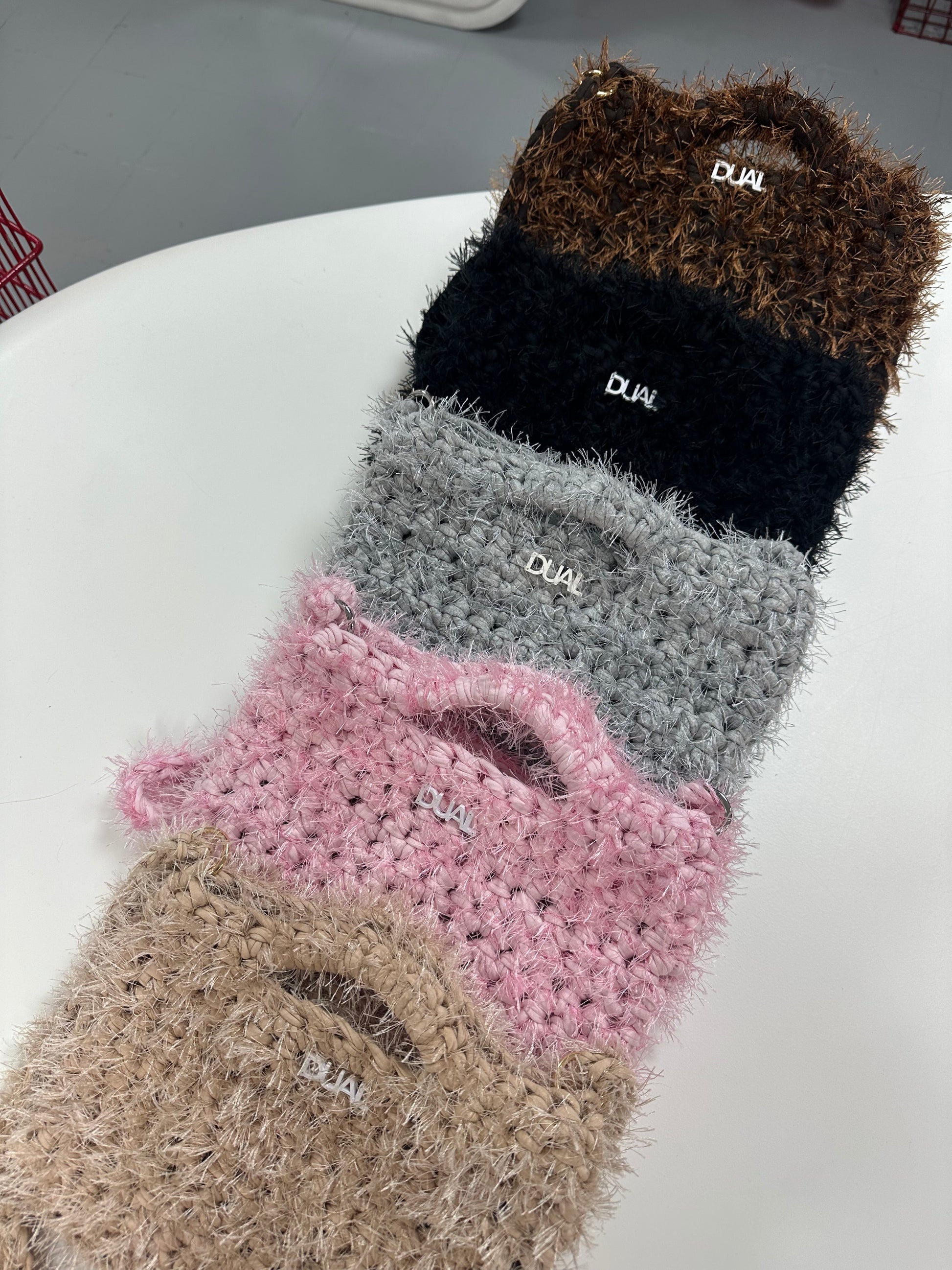 Borsa realizzata con filato in fettuccia e filato fur, morbida e leggera, perfetta per l’uso quotidiano.