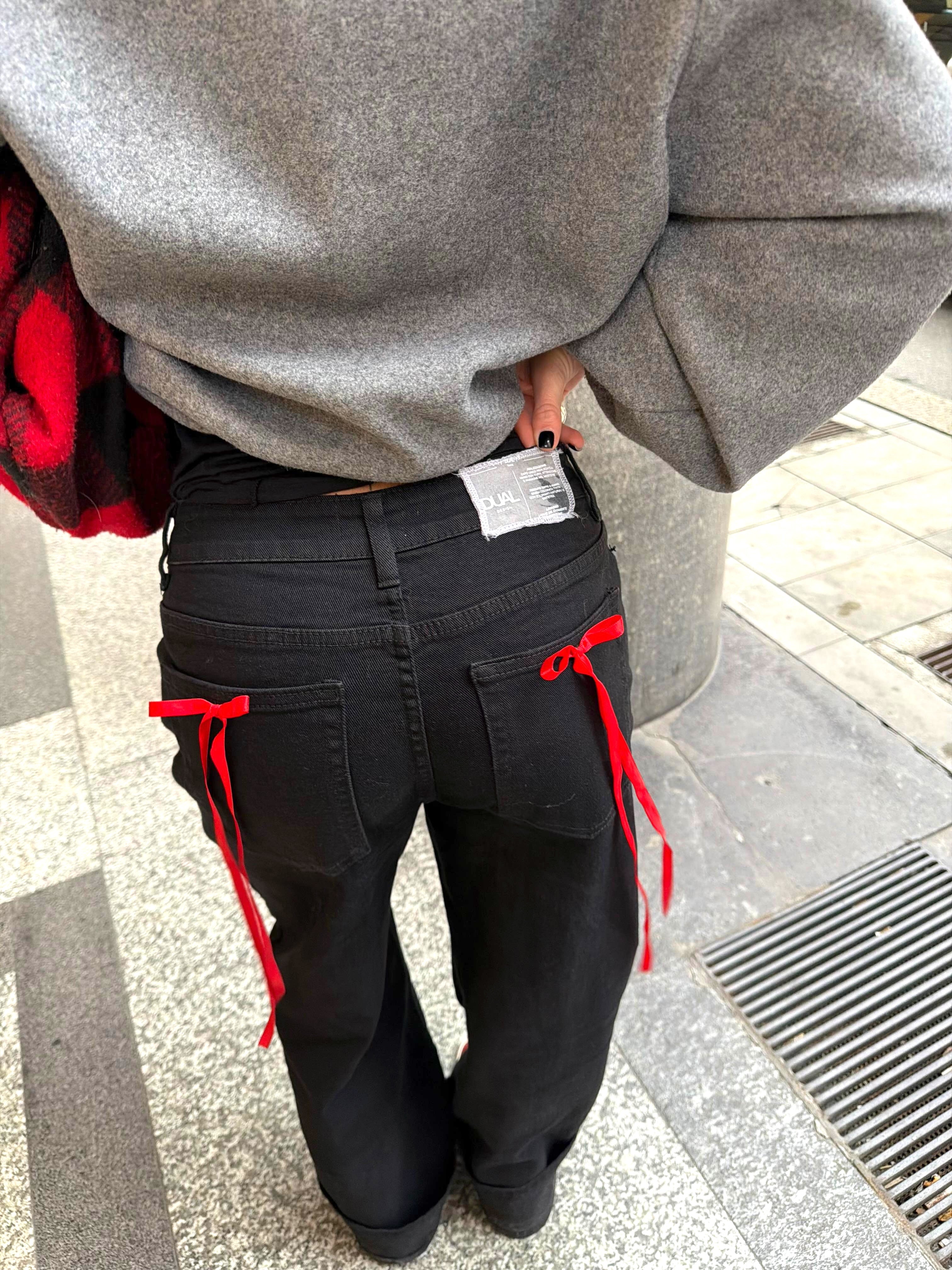 I fiocchi applicati sulle tasche posteriori, che donano un tocco femminile e originale, insieme all’etichetta tessuto in tintura personalizzata Dual Design sul retro.
