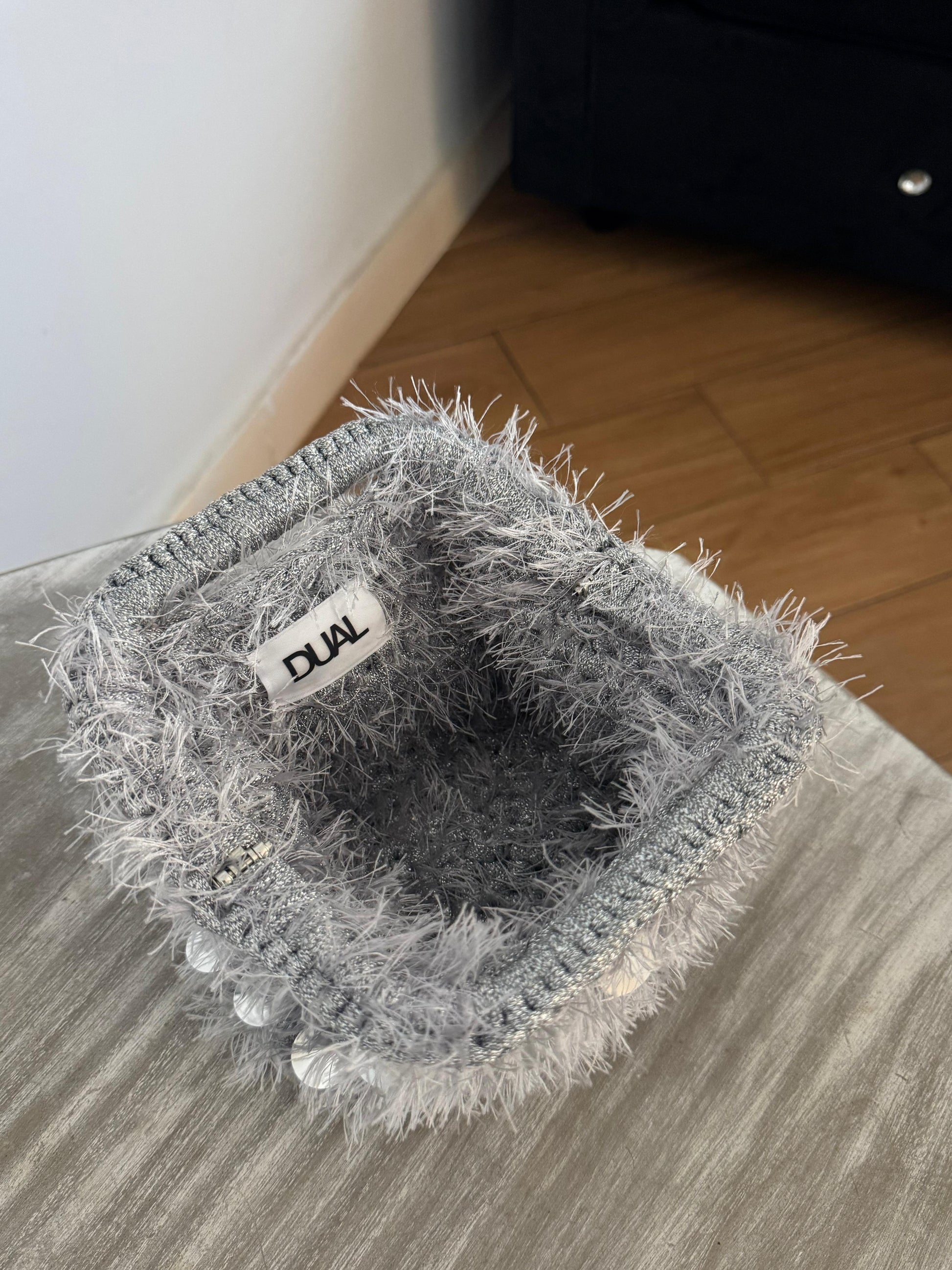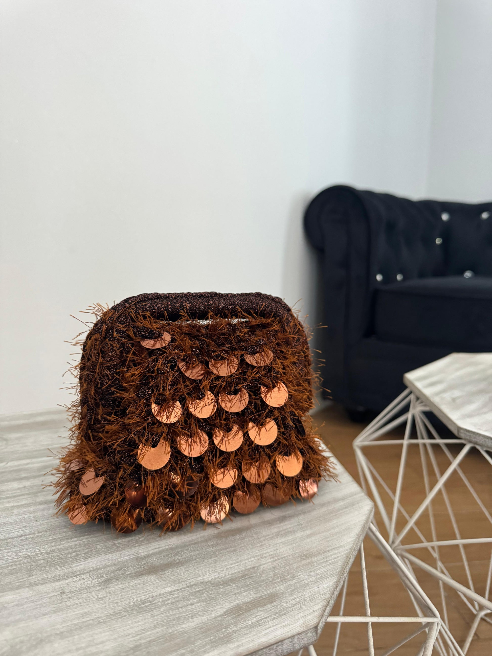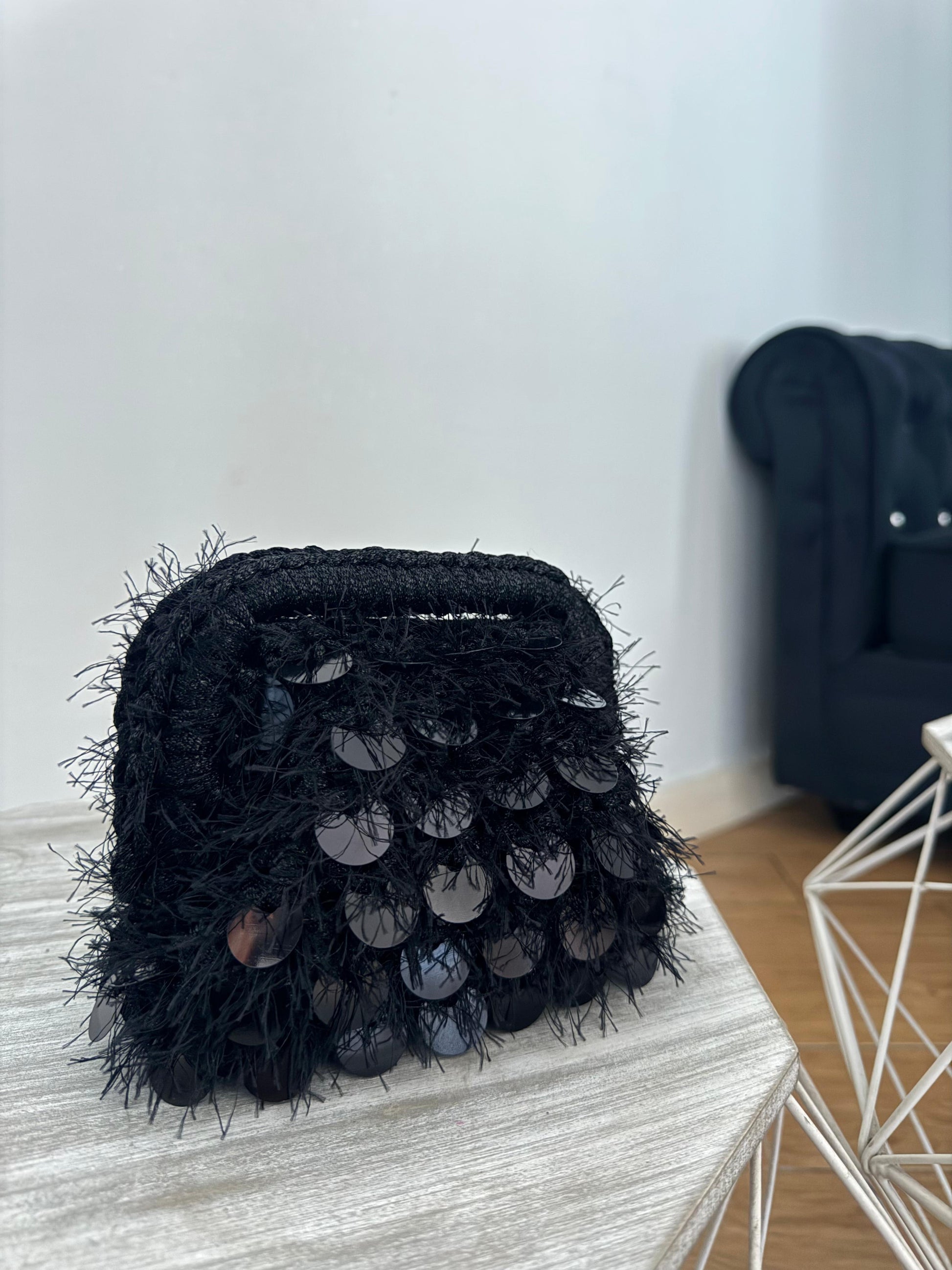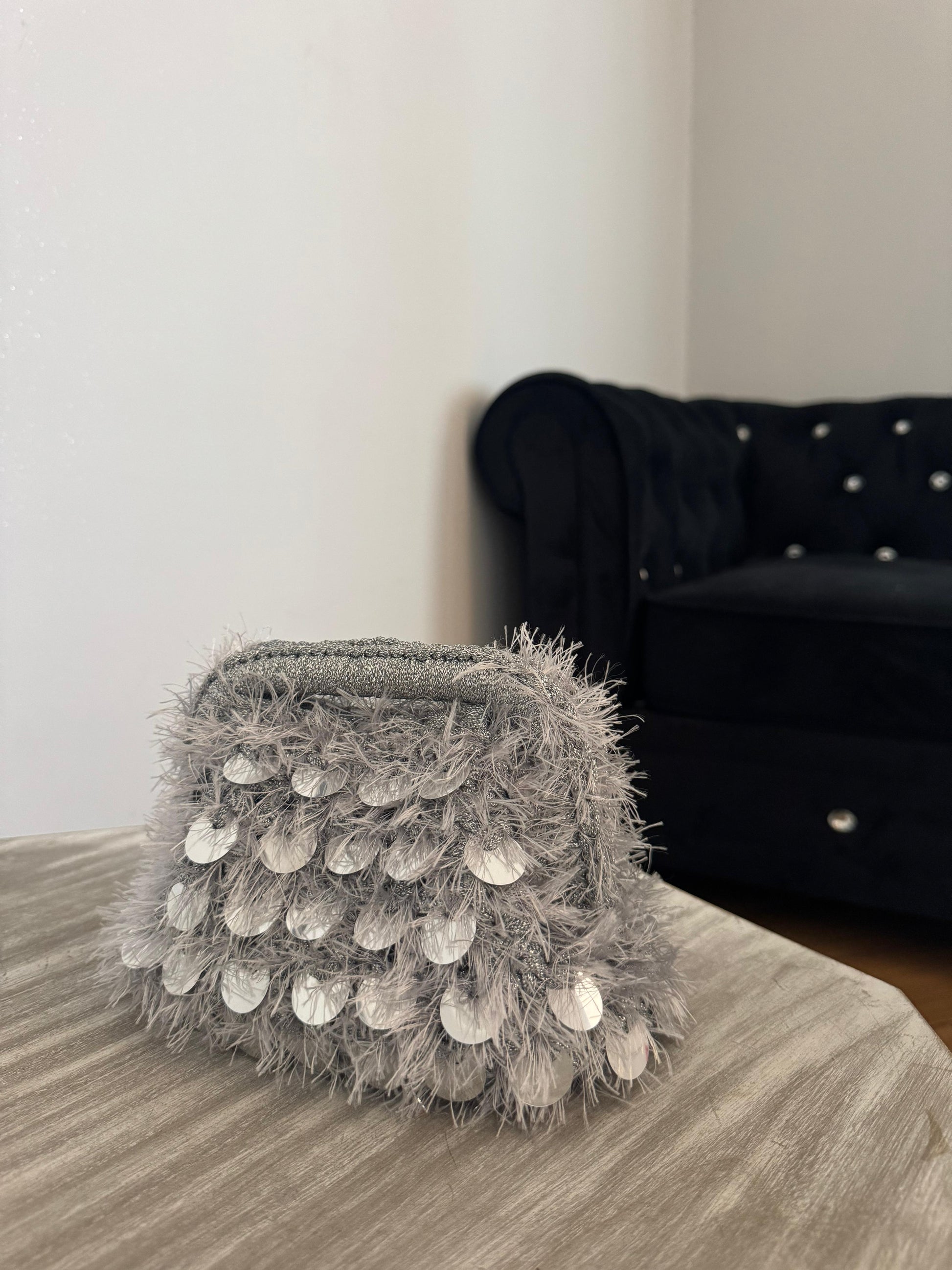 Borsa all’uncinetto con filato fettuccia lurex e filato fur con paillettes.