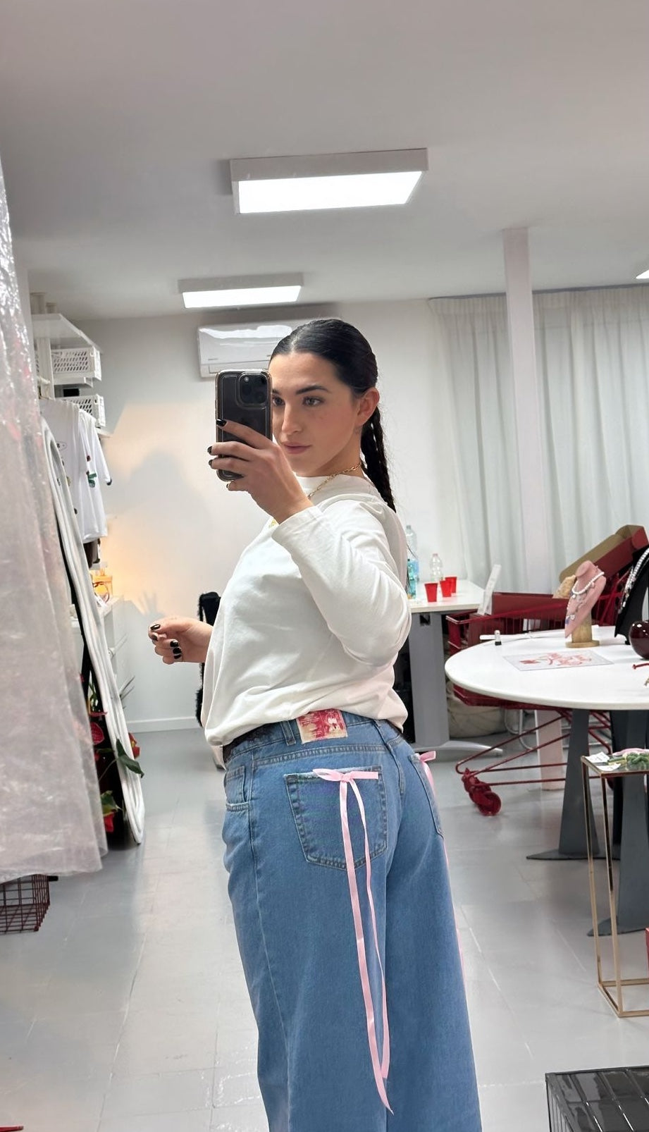 La sua particolarità? I fiocchi neri applicati sulle tasche posteriori, che donano un tocco femminile e originale, insieme all’etichetta in pelle abbinata e personalizzata sul retro.