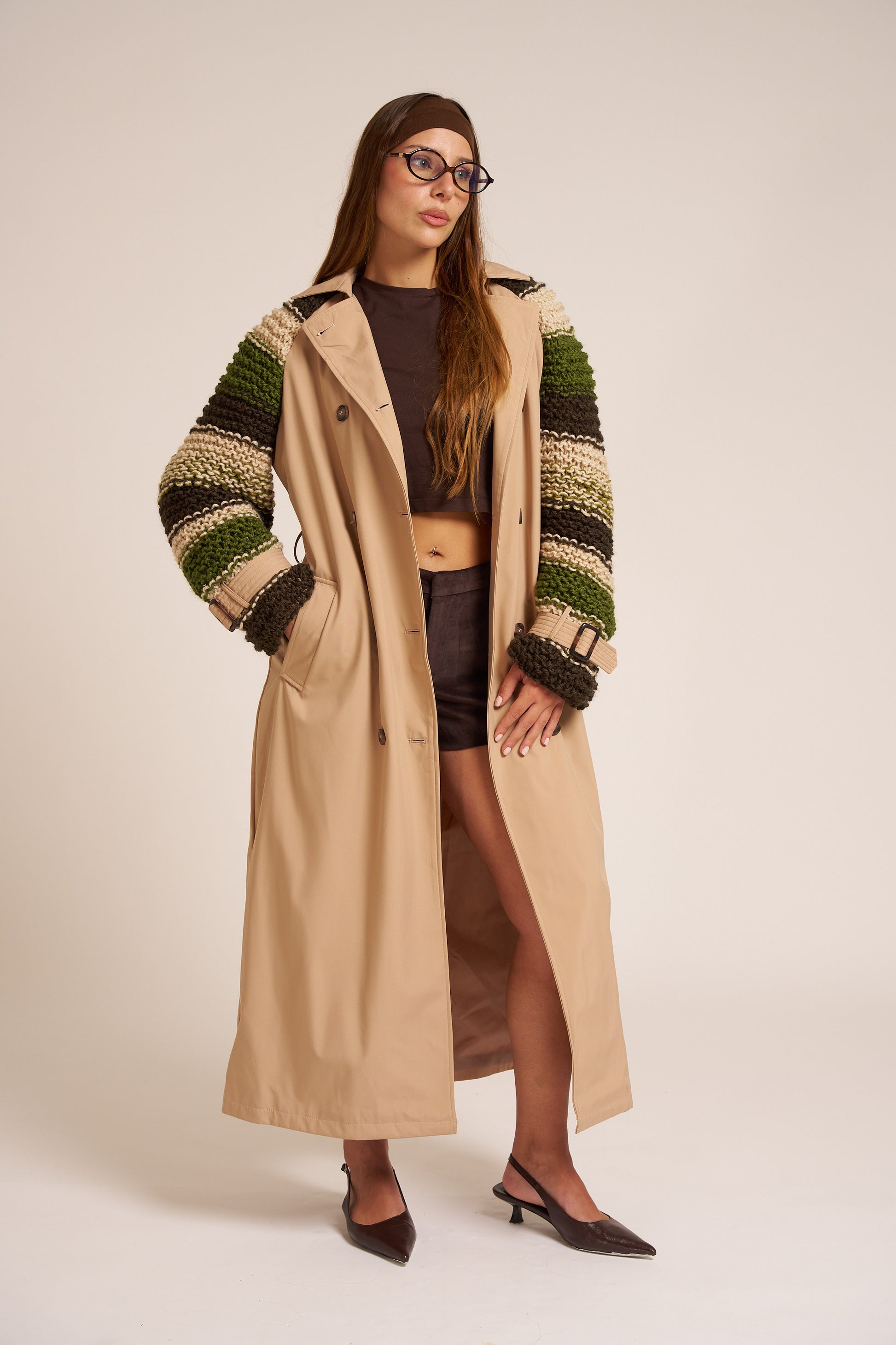 Trench color cammello con maniche in maglieria artigianale, lavorate ai ferri con lane sfumate nei toni del verde oliva, beige e marrone.