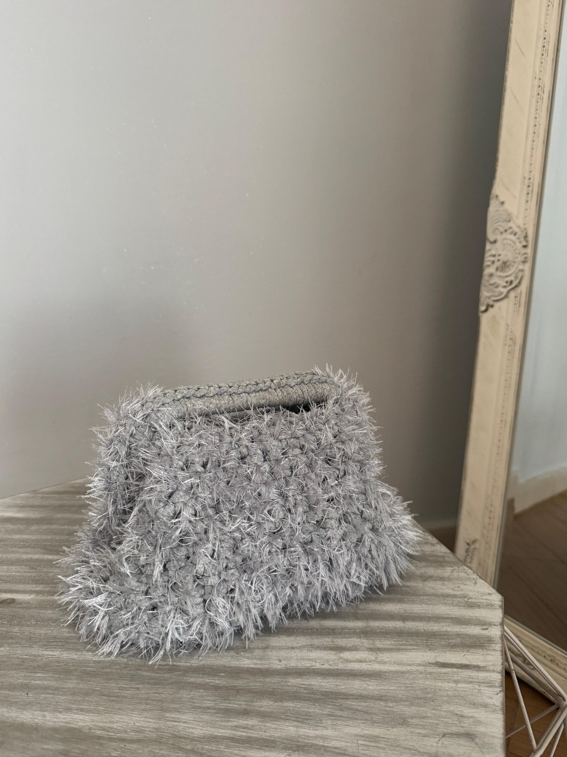 Clutch invernale in filato fur effetto pelliccia con base in pelle rigida.