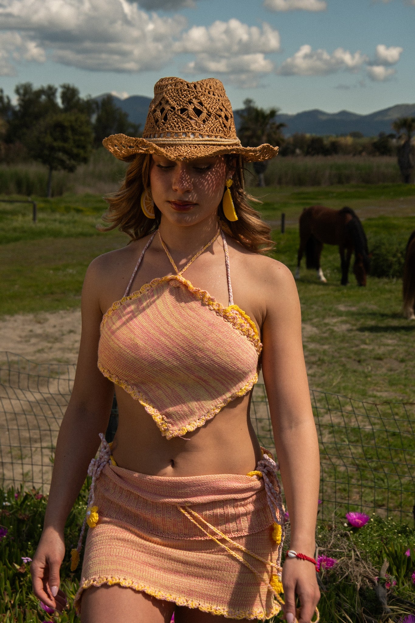 Set realizzato manualmente con macchinario industriale di maglieria, composto da due pezzi.