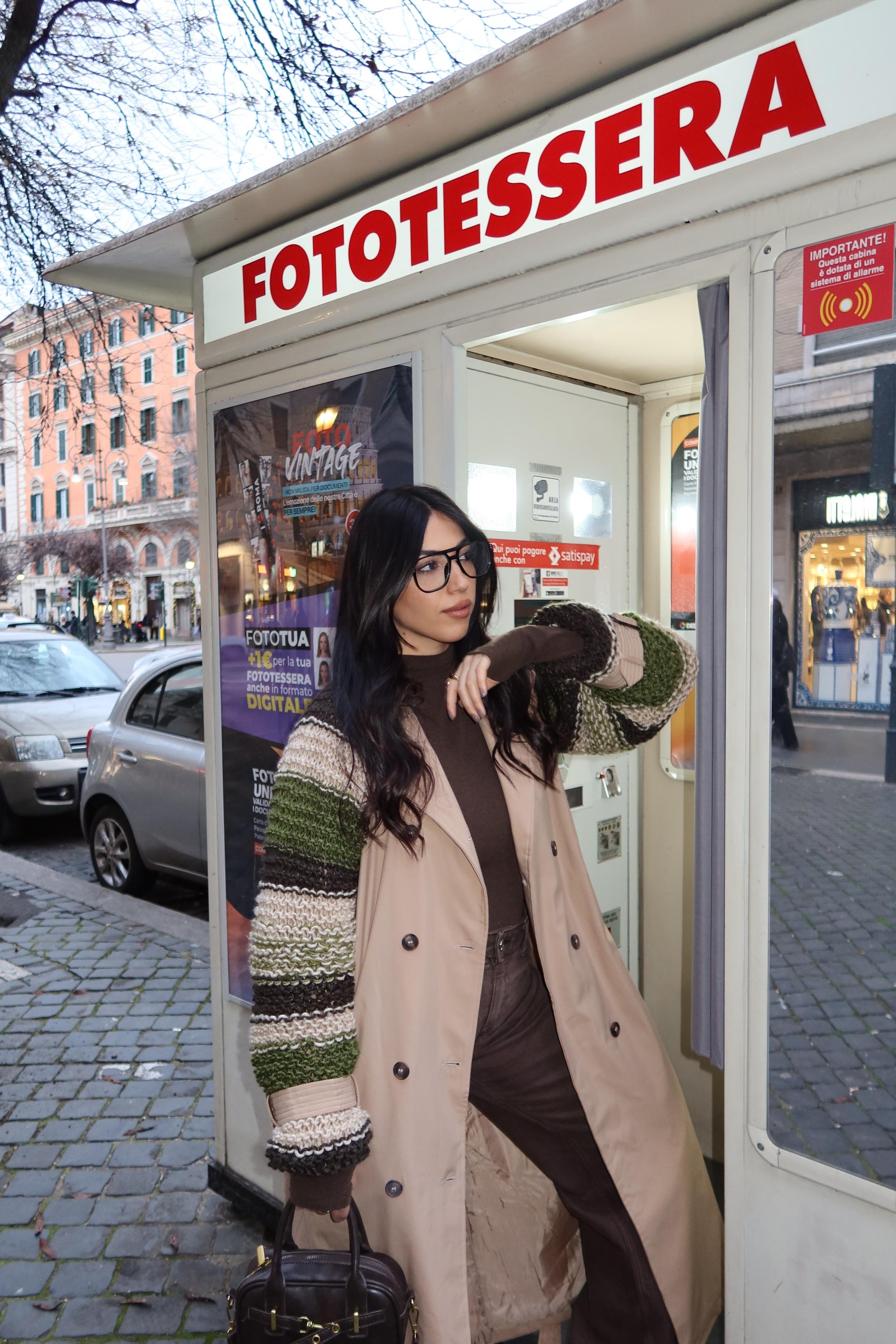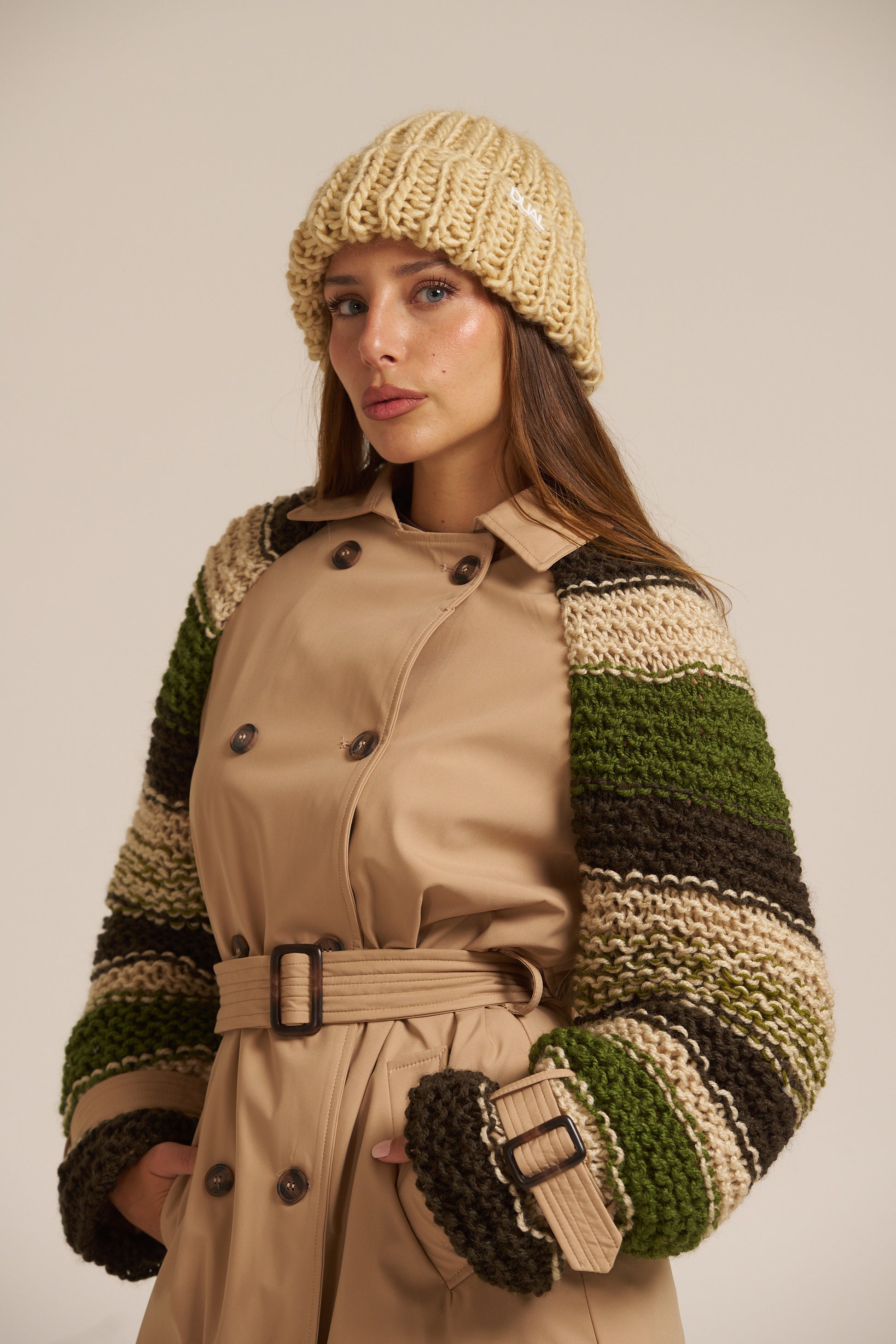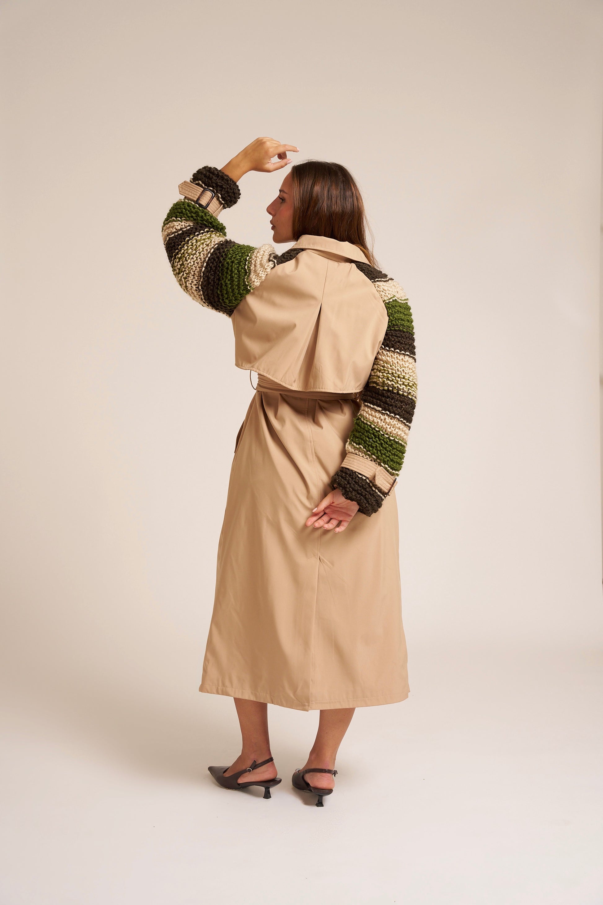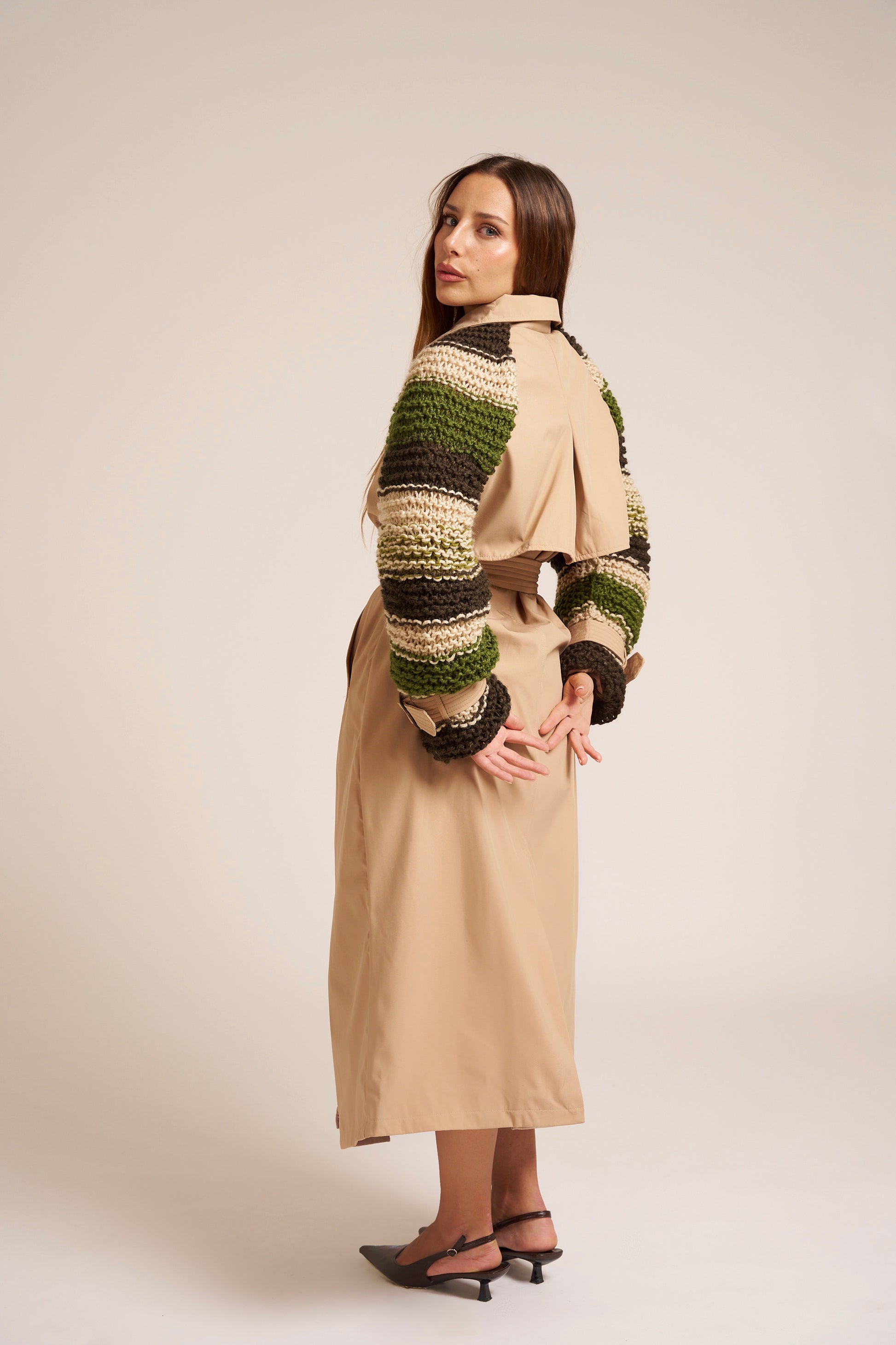 Trench color cammello con maniche in maglieria artigianale, lavorate ai ferri con lane sfumate nei